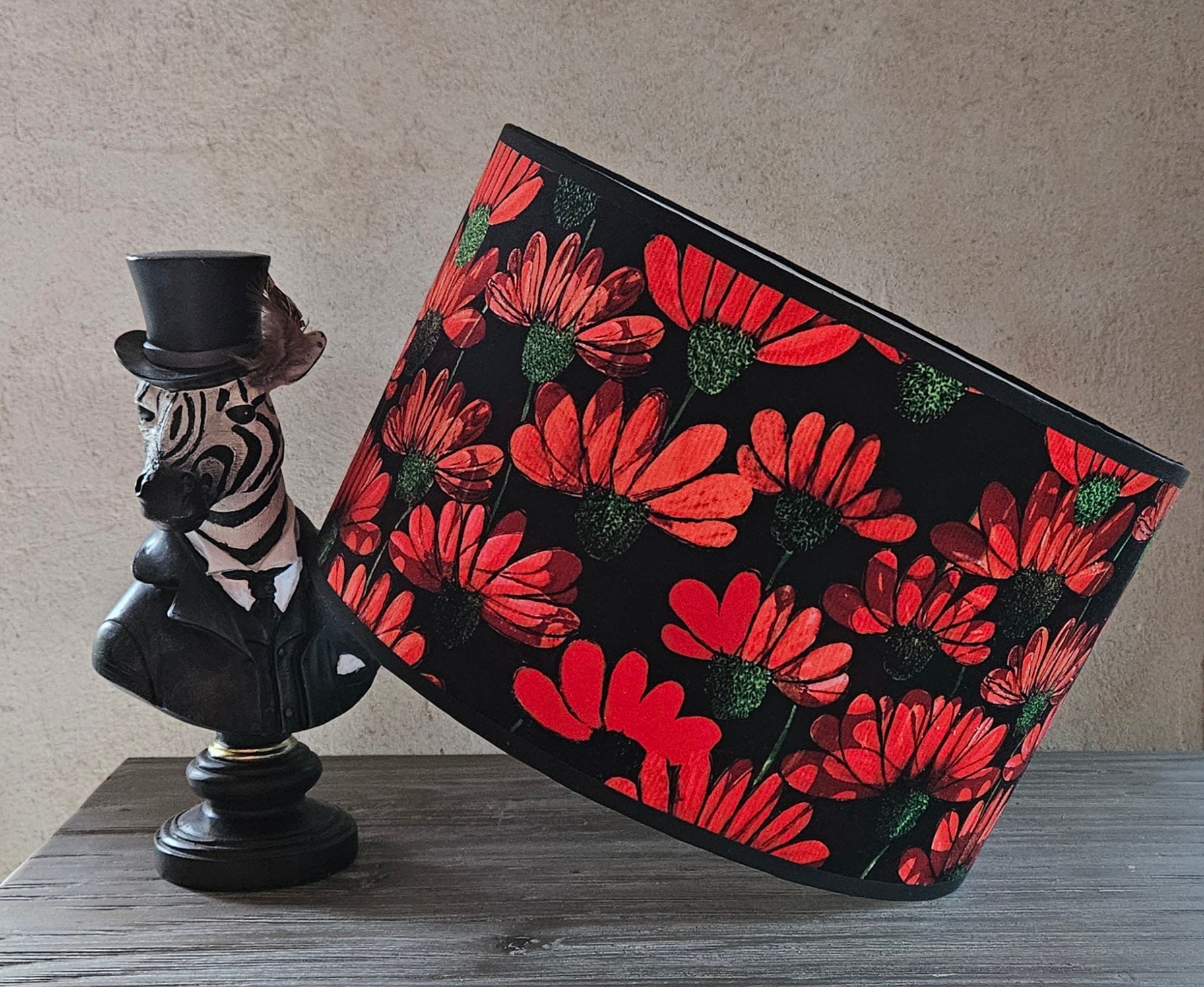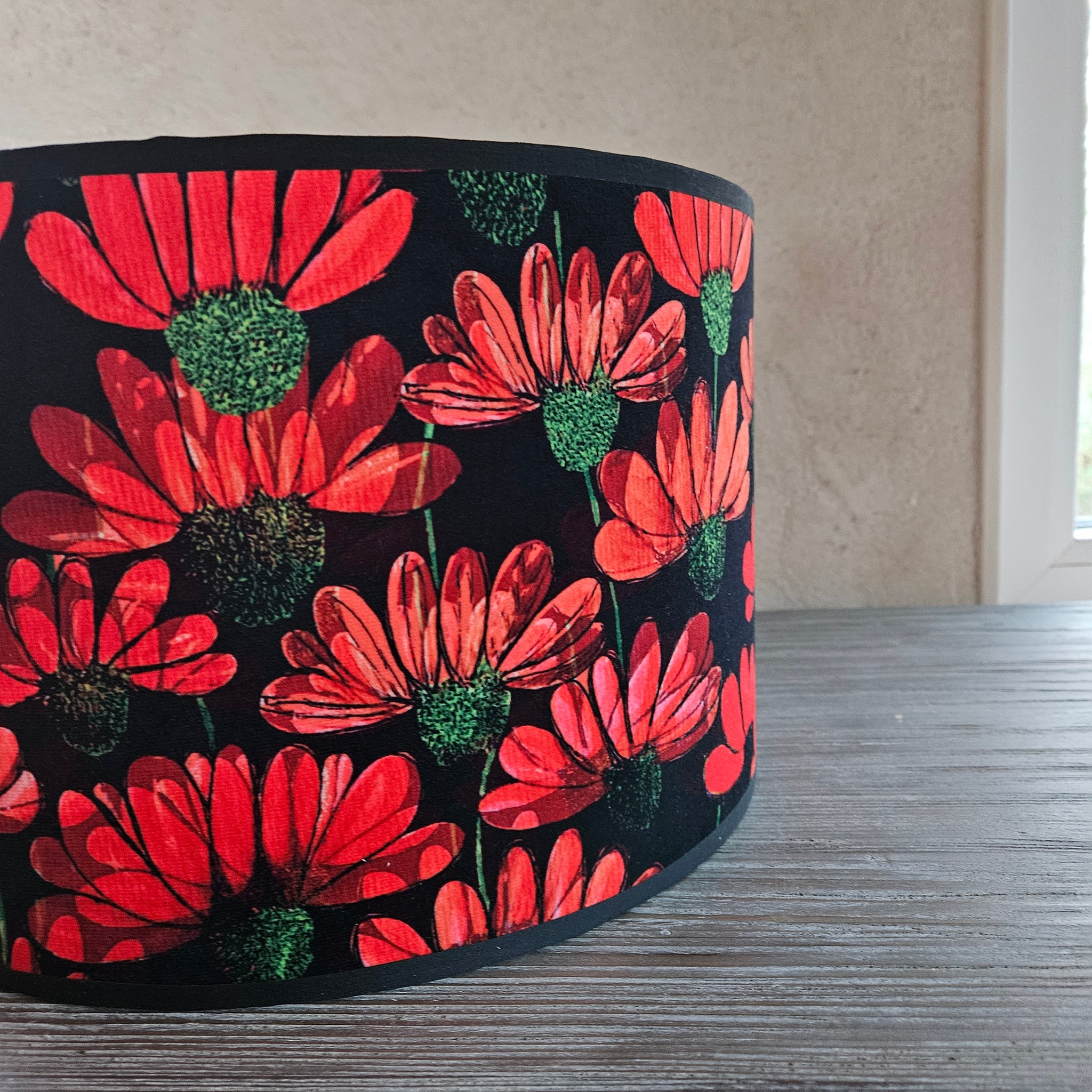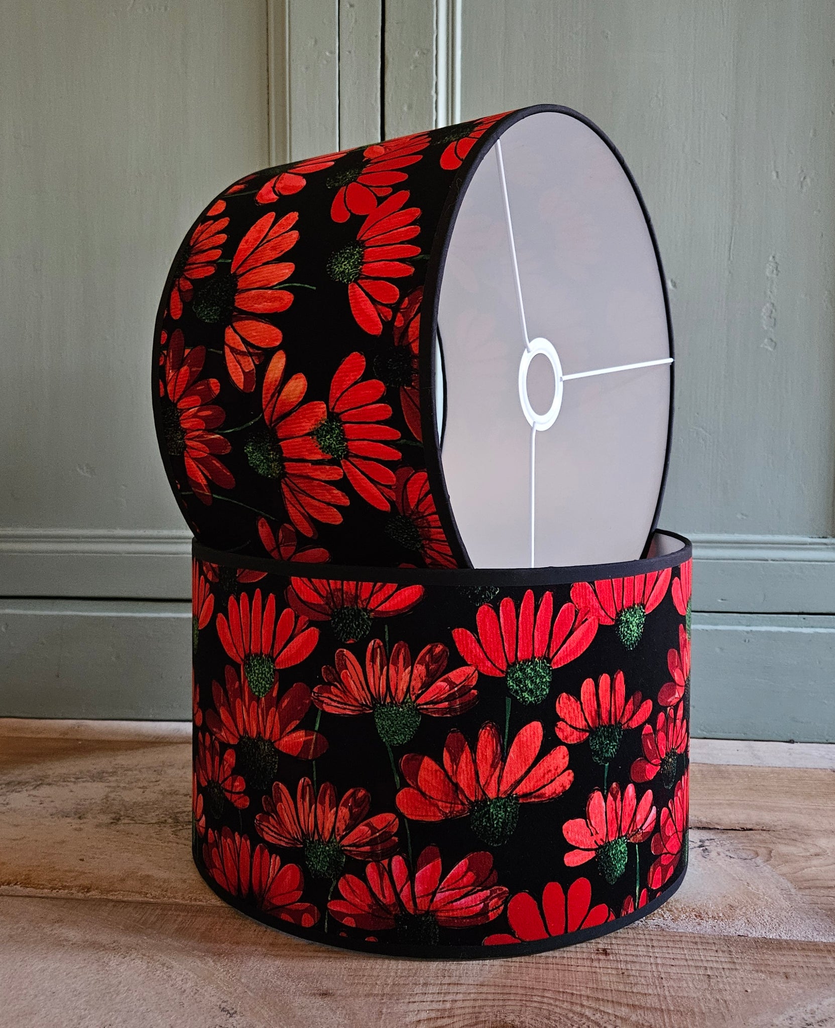 Abat-jour de forme cylindre en velours de fond noir au décor de marguerites rouges.