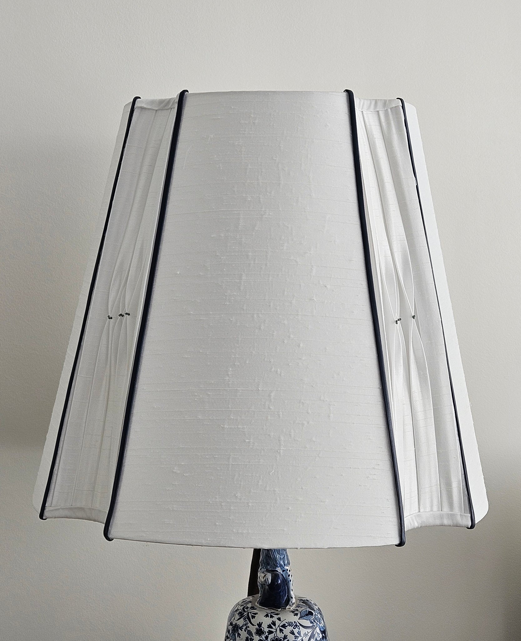 Abat-jour carré espagnol réalisé en soie blanche avec les oreilles intérieures plissées smokées perlées.