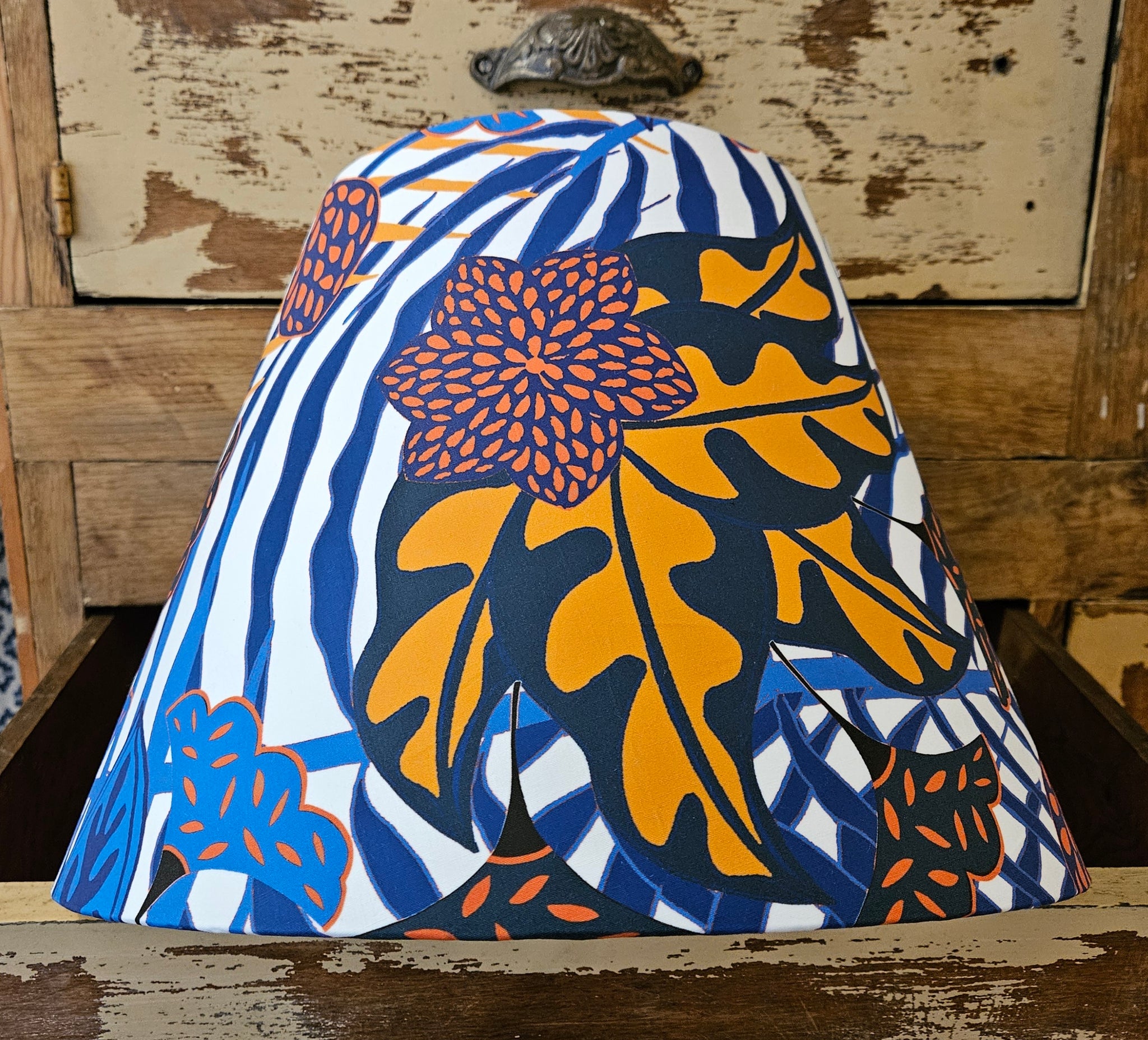 Abat-jour de forme conique au décor végétal bleu roi, corail et Orange.